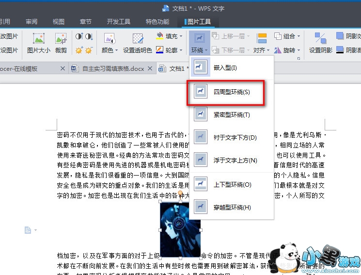 4、选中图片,点击“环绕”菜单下的“四周型环绕”,大家可以根据需要设定。