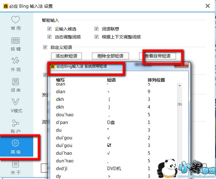 第三步:在“高级”中,找到自带短语,大家有时候不知道怎么打特殊符号或者一些特殊的字的时候,可以好好的在这里找下,应该有大家需要的