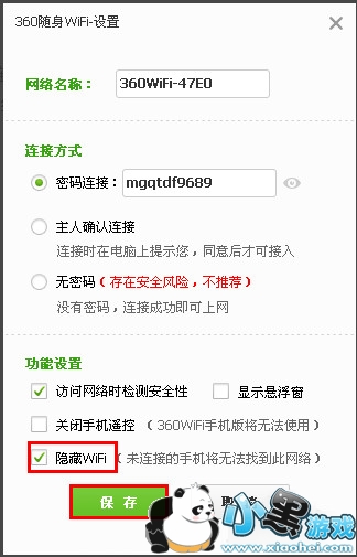 5、然后在最下方的功能设置栏,勾选“隐藏wifi”项,点击下方的“保存”按钮。