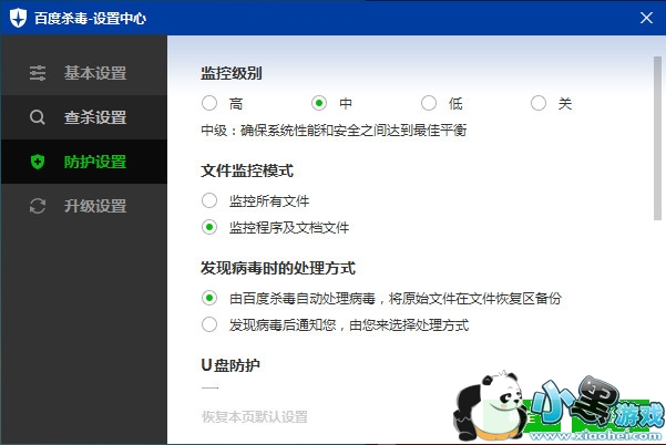我们还可以设置实时监控的一些选项,点击“菜单”,进入防护设置我们在这里可以设置一些监控参数
