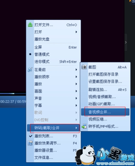 1、首先我们打开播放器,点击“主菜单”--转码/截取/合并--视频合并,或者右键选择【转码/截取/合并--视频合并】