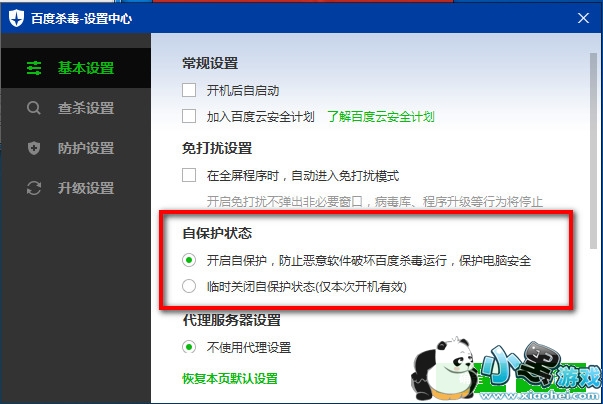 在基本设置中“自保护状态”,点击“开启自保护,防止恶意软件破坏百度杀毒运行,保护您的电脑安全运行"
