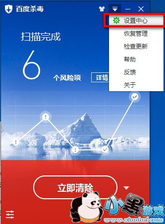 1、首先我们打开百度杀毒,然后我们可以点击“菜单”==“设置中心”