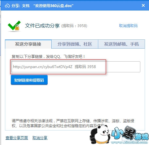 3、然后就可以看到提示了分享成功,我们复制链接,将链接发给你的朋友这样它就可以下载查看你的资源了。