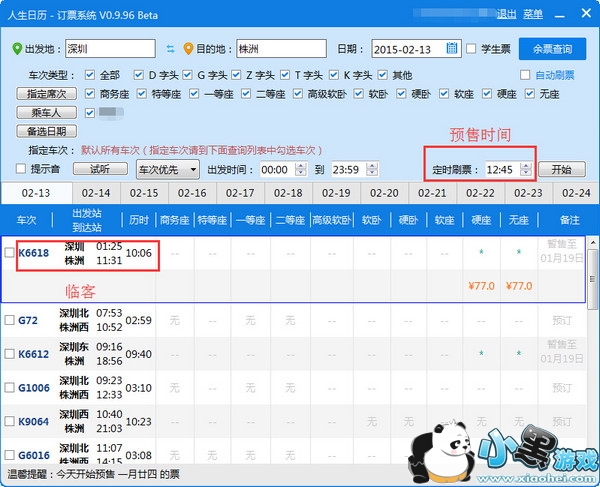 细心的童鞋应该已经看到,现在人生日历上已经可以查看到临客火车票的车次了。如从深圳到株洲,K6618、K6612为临客火车票。到1月16日临客火车票开售时,直接勾选开抢即可。