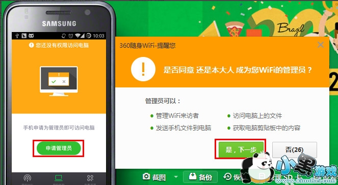 | ![]() 3、点击360wifi手机版下面三个选项中的”我的电脑“。然后点击”申请管理员“按钮。