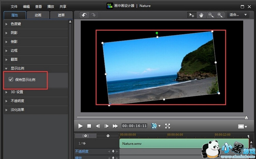 2、在弹出的的属性框,把显示比例勾选上,把视频画面等比例缩小。