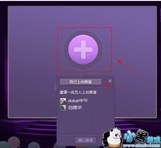 2) 由管理员在舞台中央视频播放框内点击【+】按钮,选则艺人上台表演(注:如管理员为艺人,亦可自己上台表演)