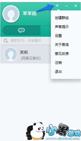 在易信的控制面板中,点击顶部的倒三角图标可以弹出主菜单。菜单中包括创建群组,设置,注销,退出等选项
