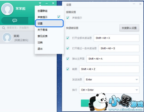 点击菜单中的设置,可以看到对于易信的很多快捷键操作,如打开全部未读消息,弹出主界面,截图等