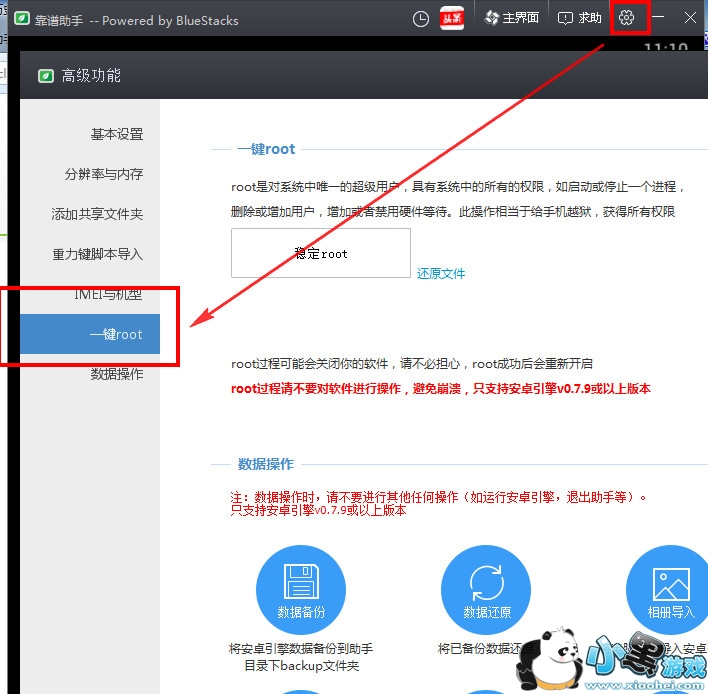 2、点击应用中的“引擎设置”按钮,点击一键root选项卡