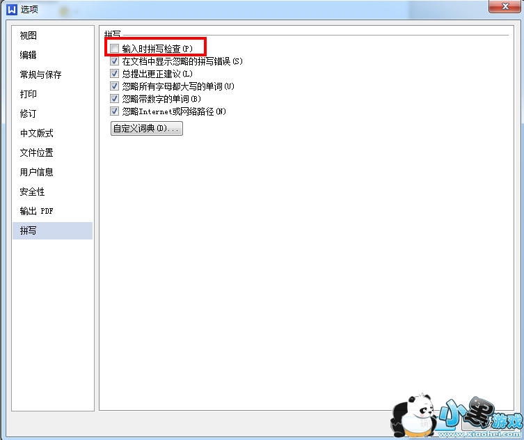 2、再设置页面选项拼写选项卡。在拼写选项卡中选择勾选掉输入时拼写检查。