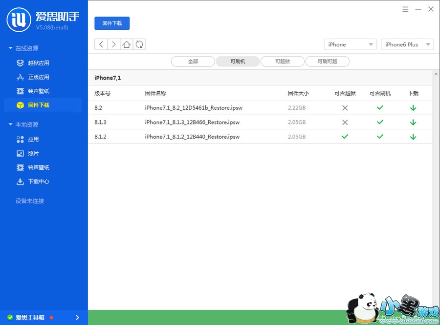 3、打开爱思助手,进入升级选项,选择固件,将设备进入dfu模式。刷机开始。