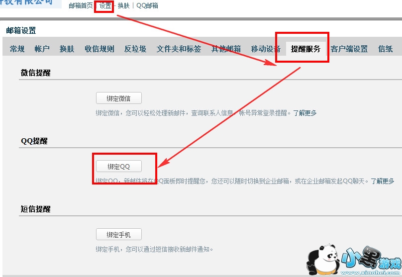 2、然后我们点击“设置”,邮箱设置中我们选择“提醒服务”在QQ提醒中我们选择“绑定QQ”