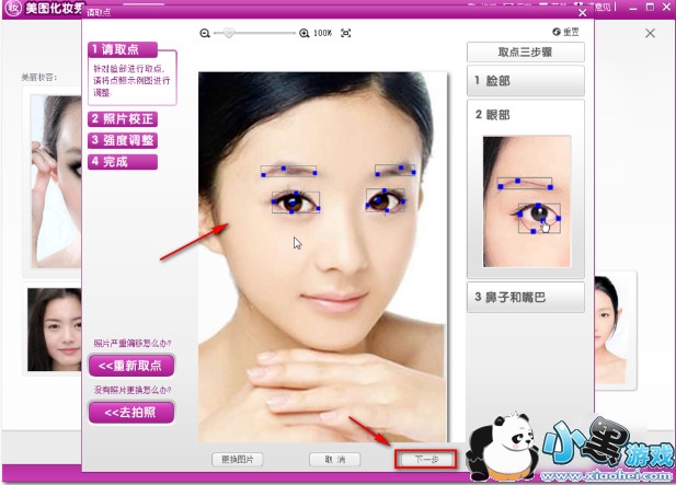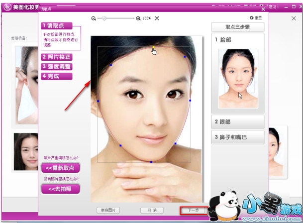 2、在弹出的窗口中需要三步,调整脸部,眼部,鼻子和嘴巴,调整一下。调整好脸部以后单击下一步