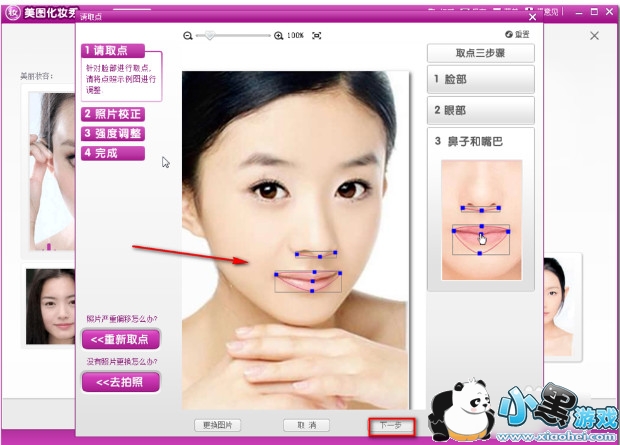4、在弹出的窗口中在调整一下鼻子和嘴巴,调整完成以后单击下一步