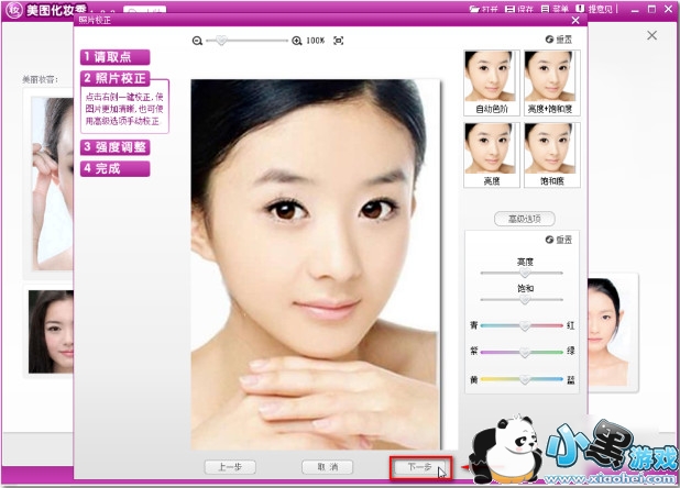 5、在弹出的窗口中调整照片的亮度和饱和度,在这里可以直接单击下一步