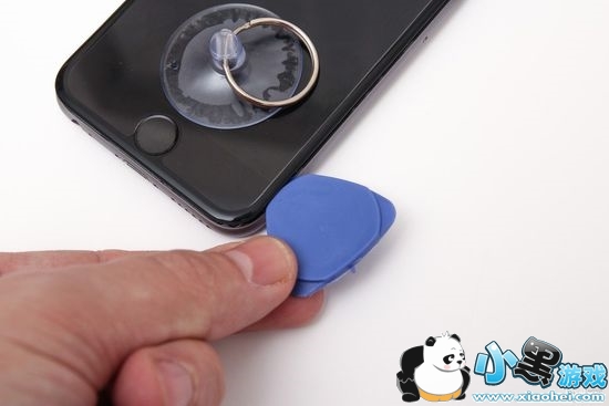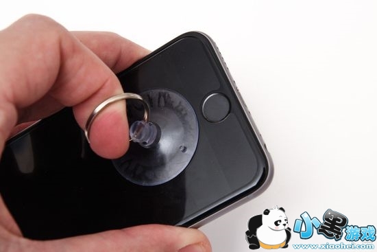 第4步:使用吸盘在主页键(Home)上方拉出屏幕。把吸盘固定在主页键的正上方,另一只手握住机身,然后往外拉。你只需要在屏幕和机身之间撬开足以塞进一个塑料片的空间。