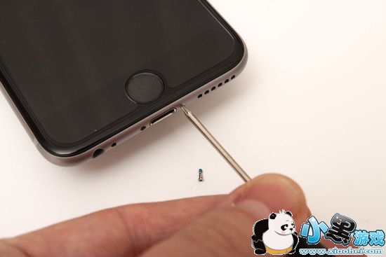 第3步:关掉手机电源,使用工具包里的五角形螺丝刀拧下螺丝。螺丝刀的头部很小,但它跟 iPhone 6底部的小螺丝是匹配的。