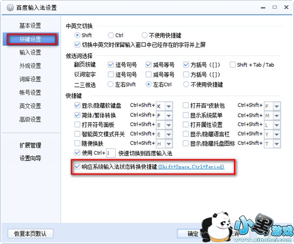 找到按钮设置选项中的“响应系统输入法状态转换快捷键”,勾上,再点确定。