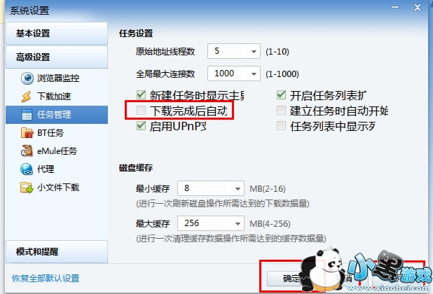 方法二:右上角点击下拉配置中心==高级设置==任务管理==下载完成后自动关机