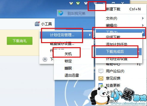 方法一:首先打开你的迅雷7,然后点击右上角“下拉”按钮,点击工具==计划任务管理==下载完成后==关机