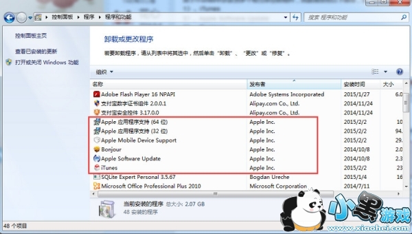 方法二:按顺序从“控制面板”—“添加或删除程序”中卸载iTunes及其相关组件。注意:发布者为“Apple Inc”的每个iTunes相关组件都需要卸载,请按照以下顺序手动卸载。