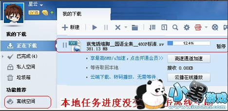 3、一段时间后,打开迅雷,任务是暂停的(进度还是我关闭迅雷时候的进度),点击离线空间