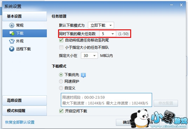 2、点击基本设置==下载===同时下载的最大任务数,我们将其设置为“1”点击“应用”和“确定”就可以了