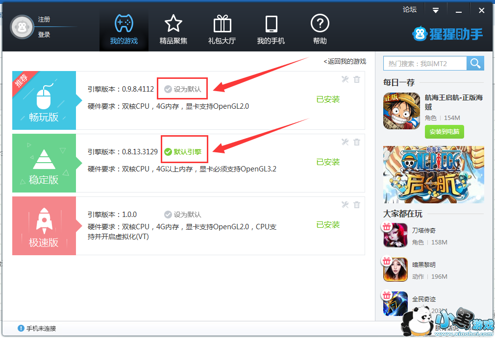 3、两个引擎安装好之后,就可以往2个引擎上添加游戏了,设置当前默认引擎,安装游戏即可安装到指定的默认引擎上。