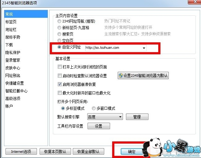 2、打开之后就需要设置了,在自定义页面输入自己的网站,然后点击确定即可!