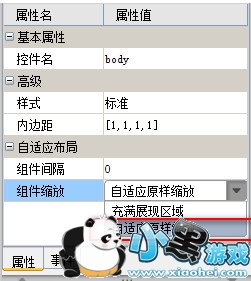 如果组件数量过多,在web端展示的时候自适应在一页内显示会比较拥挤,那么此时可以可以再右侧下方选中整体框架body,在右侧上方的属性表中将组件缩放修改为自适应原样缩放,如下图: