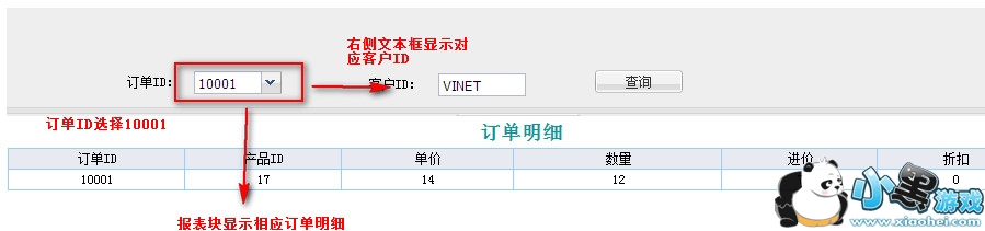效果图中,报表块里面要显示订单明细数据,根据订单ID进行过滤,新建数据集ds2:select * from 订单明细 where 订单ID=${orderid},orderid默认值为10001.