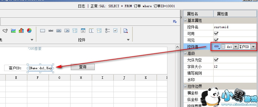 选中文本框控件拖拽到适当位置,文本框控件名为customerid,控件值选择为绑定字段,数据来源于ds1数据集中的客户ID字段,如下图: