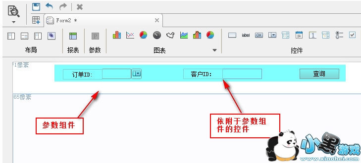 从工具栏中将参数组件拖拽至表单主体中,并将相应的四个控件:下拉框、文本、2个标签控件拖拽至参数组件中,并设置标签控件的控件值分别为:订单ID和客户ID,如下图: