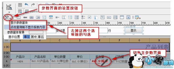 切换至参数界面,在左上角的设置按钮中,去掉显示参数窗体和点击查询前不显示报表内容两个选项前的勾,如下图