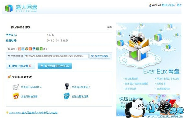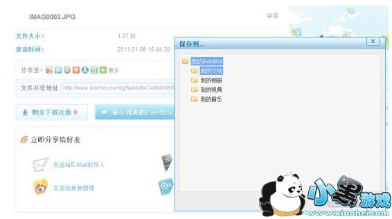注意:每个文件可以无限制的下载5次(点击弹出下载保存框算一次),次数为0后,EverBox的注册用户仍可随意下载(注册EverBox很方面,而且是免费的)。另外,注册用户还可以把这个文件转存到自己的EverBox网盘里,点击“保存到我的EverBox”,然后选择保存位置就可以了。转存到自己的网盘,不用担心找不到或者丢失了。