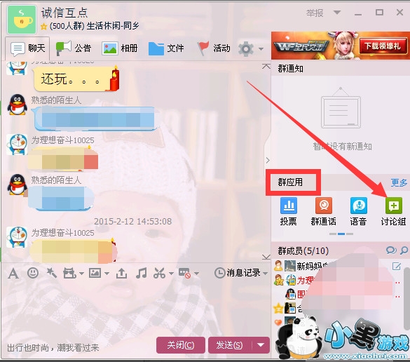 5、如果您想在群中创建讨论组,也是可以的。首先进入到群聊天页面。在群应用中找到讨论组,点击它