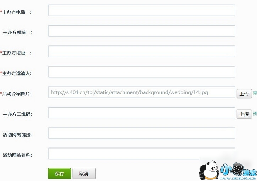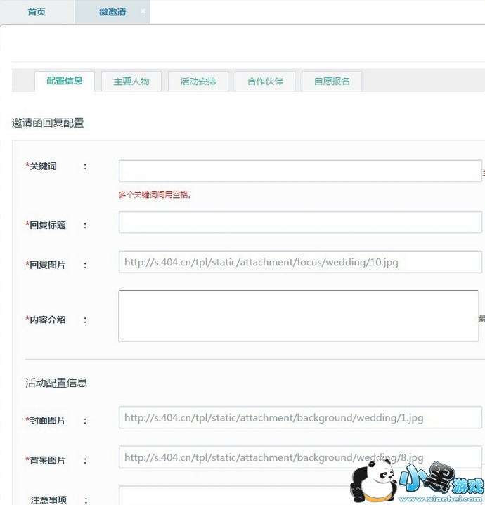 3、填写里面的关键词、回复标题、图片、内容介绍等回复配置。完成后填写活动配置信息,包括封面图片、背景图、主办方信息,二维码,关注等一系列内容。