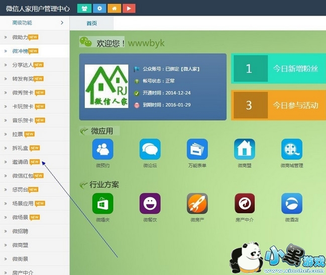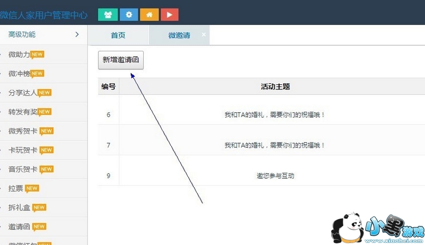 2、点击--功能管理,进入功能页面,点击左侧高级功能--邀请函--新增邀请函