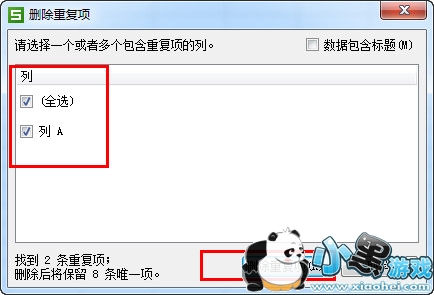 4、点击“重复项”在下拉列表中找到“删除重复项”——打开“删除重复项”复选框,在复选框中你可以设置查找重复项的范围:比如我这里是点击了“全选。——最后点击“删除重复项”就OK了。