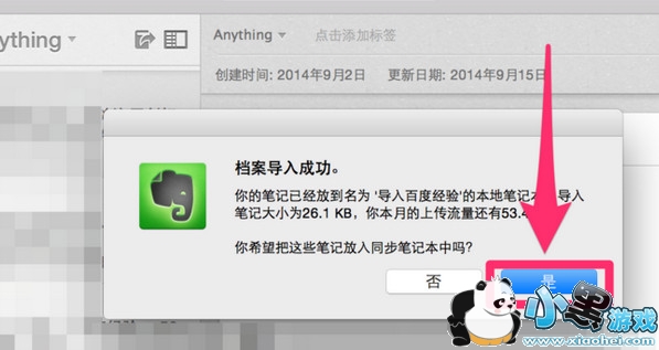 3、此时会提示笔记已经导入成功,并会询问是否加入新的笔记本,一般选择“是”就可以了,然后再去新笔记本找到导入的笔记来转移至其他笔记本。