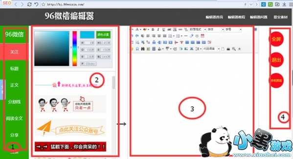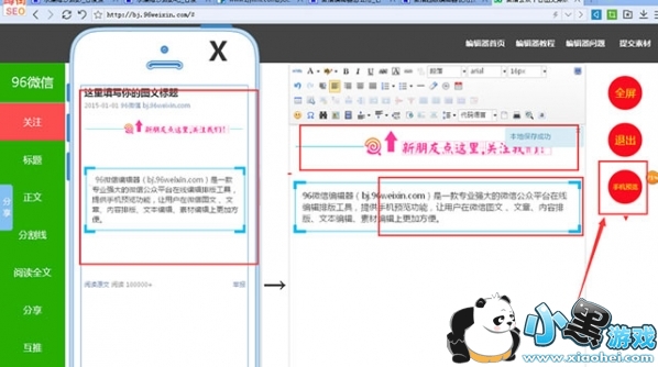 首先大家进入96微信编辑器页面,然后可以看到分为四块,最左边是素材导航,有微信公众平台关注素材、标题、正文、分割线、阅读全文、分享等素材导航,在第二块位置是素材库,里面收集了很多最新的微信公众号素材,素材在慢慢更新中,第三块是编辑内容,大家可以再编辑框里面排版,文章撰写等。最右边是三个按钮,最下面的是手机预览,这个是96微信最大的特点,因为别的微信编辑器都没有预览功能,本编辑器带有预览功能。