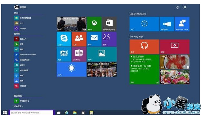 Win10采用了将Win7一样的传统开始菜单与磁贴相融合的设计方式。左边一栏显示的是常用程序和所有程序,右边显示常用的磁贴工具。