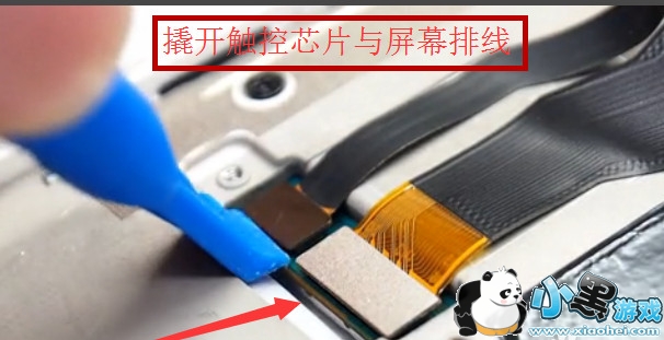 5、“固定盖片”取下来,用撬棒将触控排线与屏幕排线剥离。注意撬棒的使用角度和力度,避免排线的损坏。同时完全拿掉坏掉的屏幕。