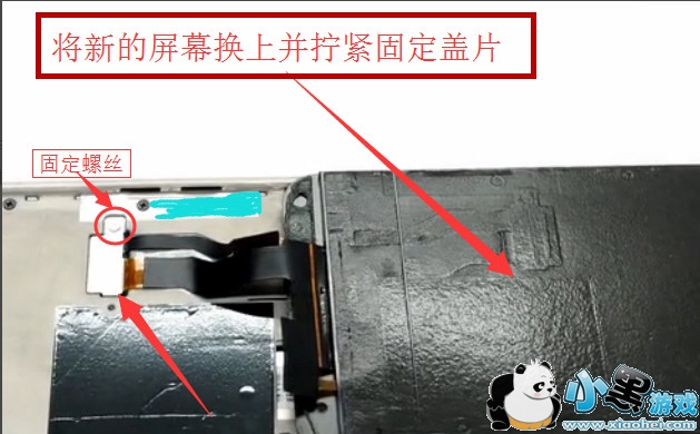 6、将完好屏幕的三分之一放在机身上,将屏幕与触控排线放在装在卡槽上,并拧紧“防护盖片”。具体操作如图所示。