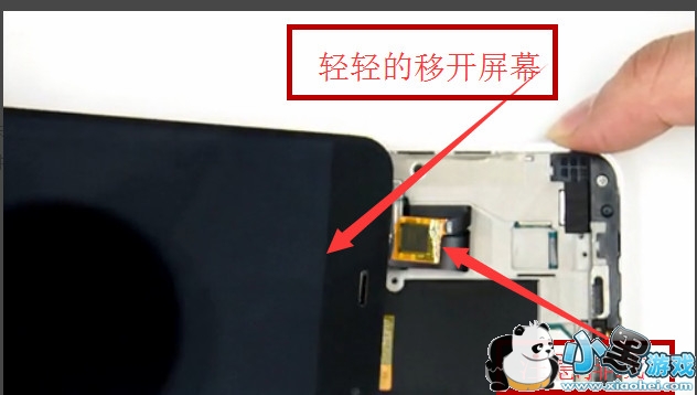3、移开屏幕。当你进行完上一步骤后,屏幕以及松动。现在你的左手拿住屏幕末端,右手按在机身,慢慢拿开屏幕,在拿开的同时注意屏幕与机身间的排线。
