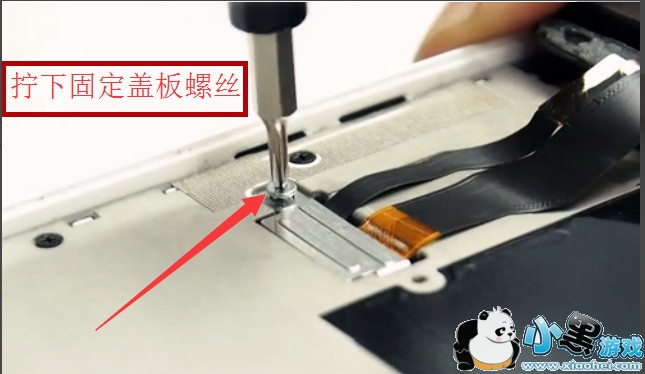 4、当屏幕与机身分离后你会看到排线所在的地方,用螺丝刀拧下螺丝,用镊子取下排线固定盖片,并将取下来的零件分类放好。具体操作如图所示。