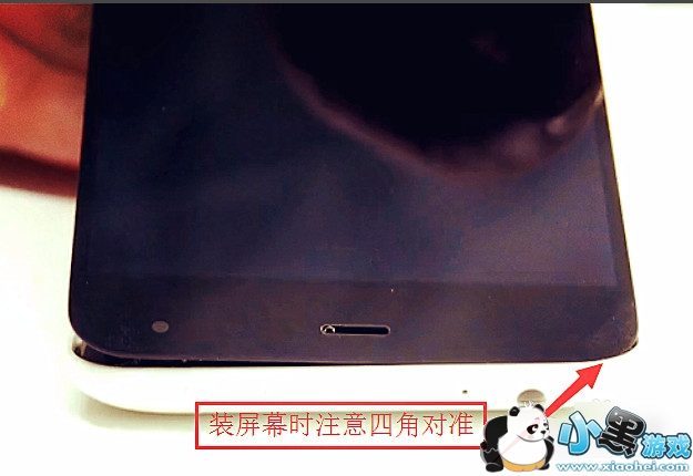 7、将屏幕与机身粘合,在安装屏幕时,注意屏幕四角与机身四角对齐。具体操作如图所示。