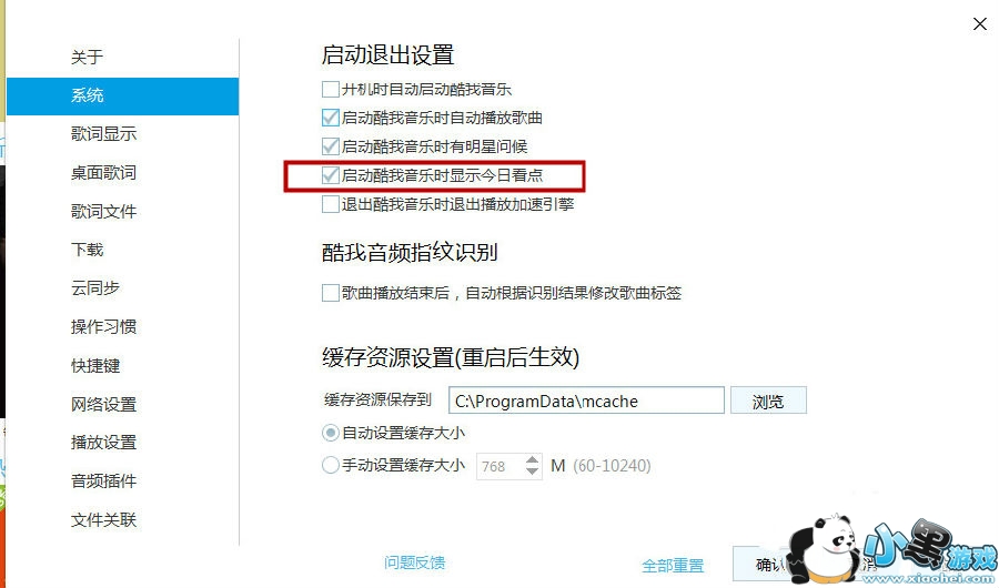 3、系统设置界面,启动退出设置下找到“启动酷我音乐时显示今日看点”取消勾选“启动酷我音乐时显示今日看点”,然后点击“应用”==“确定”
